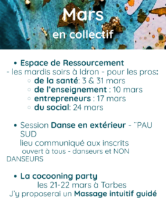 L’occasion de se rencontrer, de parler d’outils somatiques (peinture corporelle, massage intuitif guidé, danse santé)
